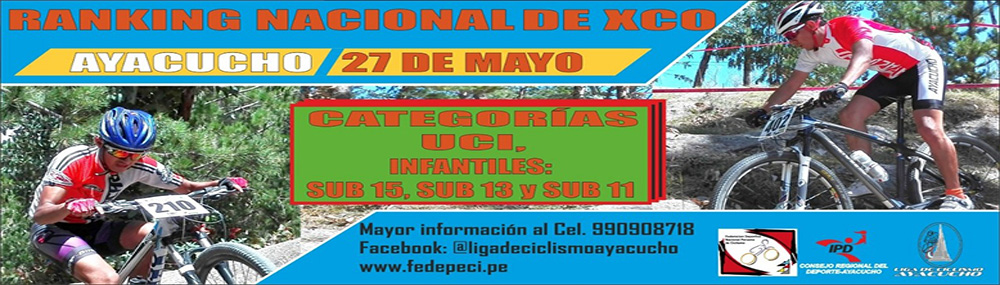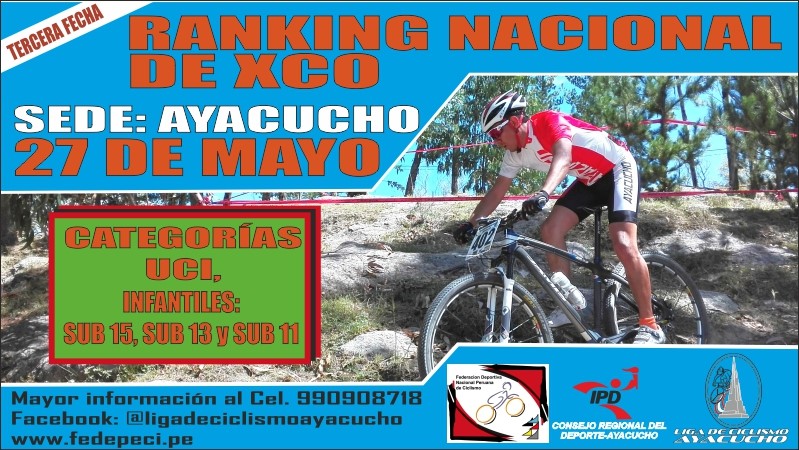 Todo ciclista Federado puede participar de la Tercera Fecha del Ranking Nacional de XCO 2018, el mismo que esta previsto para desarrollarse el 27 de mayo en la ciudad de Ayacucho, en todas las categorías UCI de acuerdo a lo establecido por la FEDEPECI (Cadetes, Junior, Sub 23 y Elite Varones y Damas).