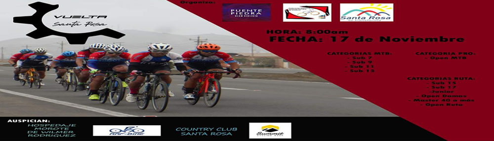 Convocatoria al CAMPEONATO DE CICLISMO VUELTA A SANTA ROSA – dirigido a las Ligas, Clubes y Equipos A NIVEL NACIONAL. Este Campeonato se desarrollará EL 17 DE NOVIEMBRE, desde las 8.00 hasta las 14.00 en el distrito de Santa Rosa- Provincia de Lima.