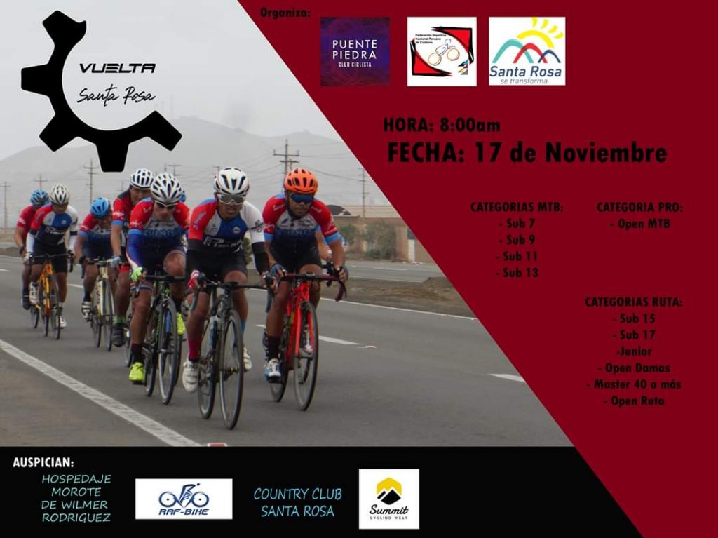Convocatoria al CAMPEONATO DE CICLISMO VUELTA A SANTA ROSA – dirigido a las Ligas, Clubes y Equipos A NIVEL NACIONAL. Este Campeonato se desarrollará EL 17 DE NOVIEMBRE, desde las 8.00 hasta las 14.00 en el distrito de Santa Rosa- Provincia de Lima.